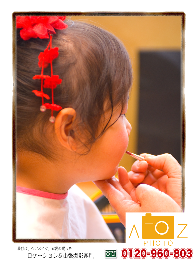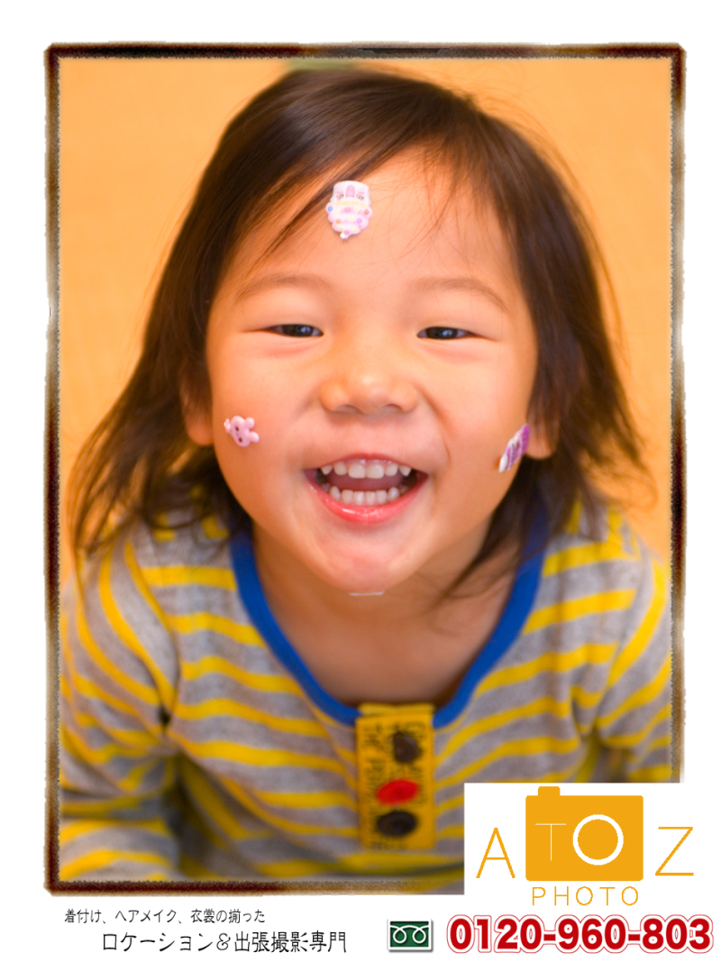 お姉ちゃんが先にヘアメイク、着付けしました。順番待ちの時間に自分の顔にシール貼りたくってました。子供って予想だにしない可愛いことすることあります。ちゃんと写真に残してあげました(笑)